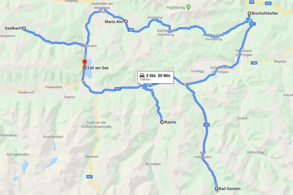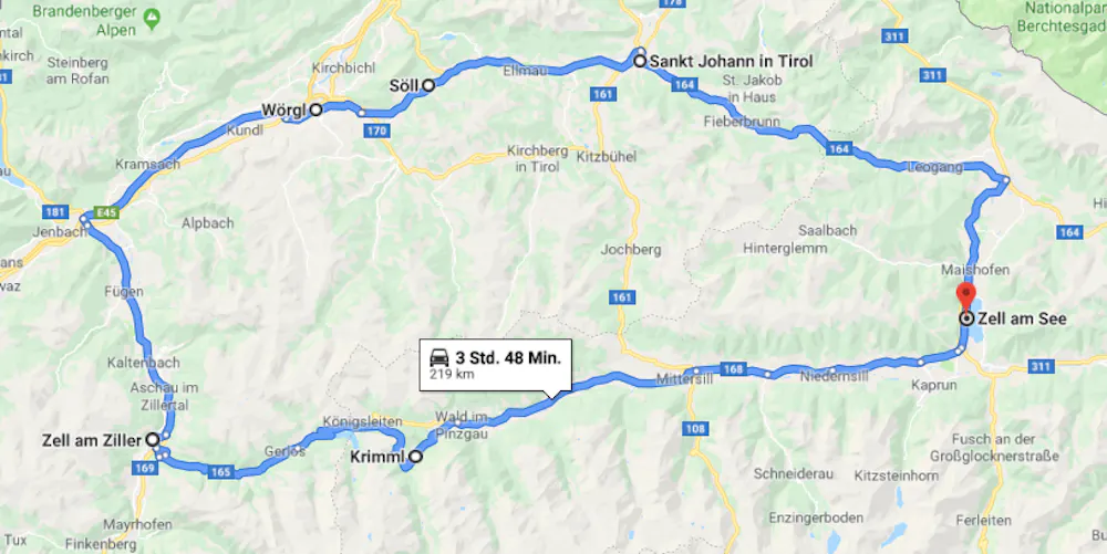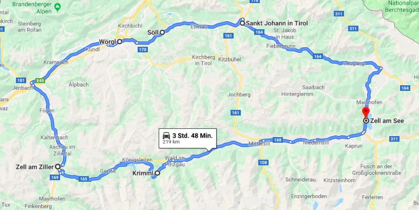 Start in Zell am See and travel through the Salzach valley into the direction of Krimml. On the winding roads of the “Gerlospass” you will see Europe’s highest waterfalls and reach the Zillertal afterwards. It is definitely worth a stop in Mayrhofen. You will travel back via the “Brixental” and pass famous Kitzbühel, before you climb your last saddle the “Pass Thurn” Highlight: Krimml Waterfalls, Zillerertal and Kitzbühel.